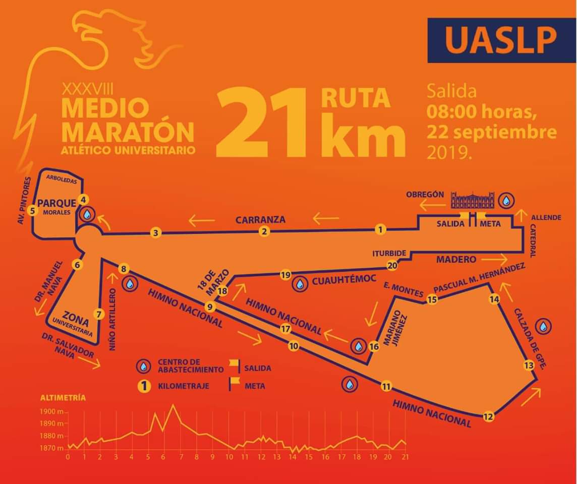 Este domingo 22 septiembre, en punto de las 8:00 horas, se correrá la edición número 38 del Medio Maratón Universitario, lid que tendrá salida y meta frente al edificio central de la UASLP, en la Plaza de los Fundadores.