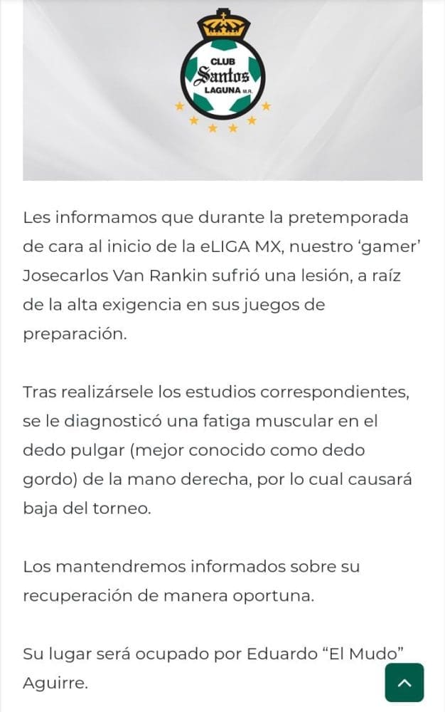 “Les informamos que durante la pretemporada de cara al inicio de la eLIGA MX, nuestro ‘gamer’ José Carlos Van Rankin sufrió una lesión, a raíz de la alta exigencia en sus juegos de preparación.”, explicaron en un comunicado.
