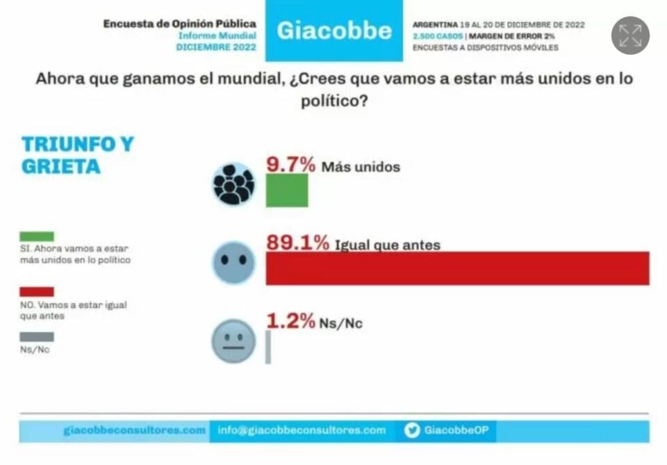 Por si fuera poco, la fiebre mundialista es “indiferente” según los encuestados para revertir la situación del país. A pregunta expresa de “Ahora que ganamos el Mundial, ¿Crees que vamos a estar más unidos en lo político?”, la respuesta fue contundente: Igual que antes con el 89.1%.