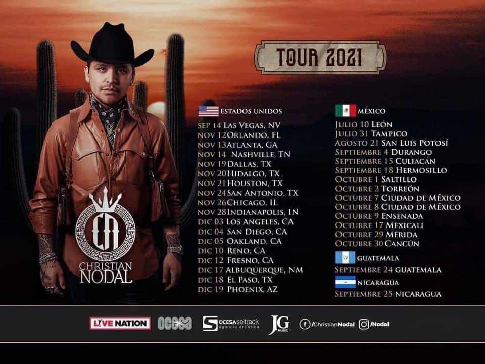 En la lista de ciudades que visitará Christian Nodal, se incluyen León, Tampico, Mexicali, Ciudad de México, San Luis Potosí, Culiacán y Sonora; pero también se anuncia la gira en Estados Unidos, a partir del mes de septiembre, en ciudades como Dallas, Houston, El Paso, en Texas; Los Ángeles, San Diego y Oakland, en California.