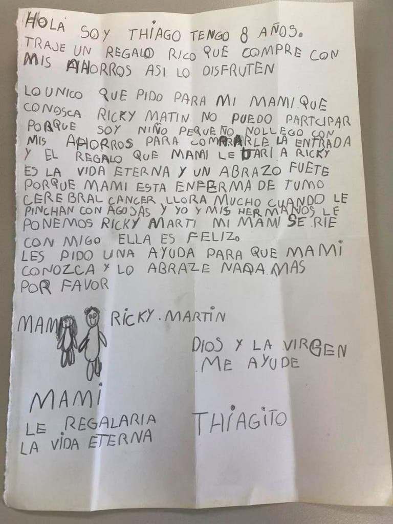 “Hola, soy Thiago. Tengo 8 años. Traje un regalo rico que compré con mis ahorros. Así lo disfruten, lo único que pido para mi mami que conozca a Ricky Martin. No puedo participar porque soy niño pequeño, no llego con mis ahorros para comprarle la entrada.