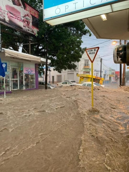 Una fuerte lluvia que se registró este jueves en el municipio de Matehuala, dejó varios autos varados y una Plaza de Armas inundada, frente a