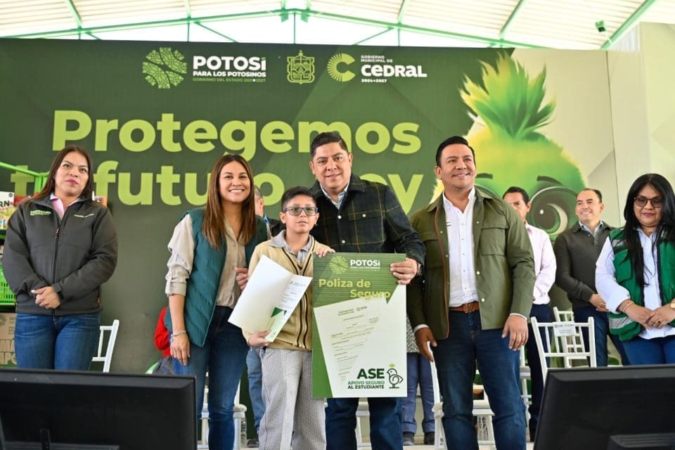 El Gobernador del Estado inauguró obras educativas en Cedral y Matehuala y entregó pólizas del programa Apoyo Seguro al Estudiante. En Cedral también brindó apoyos