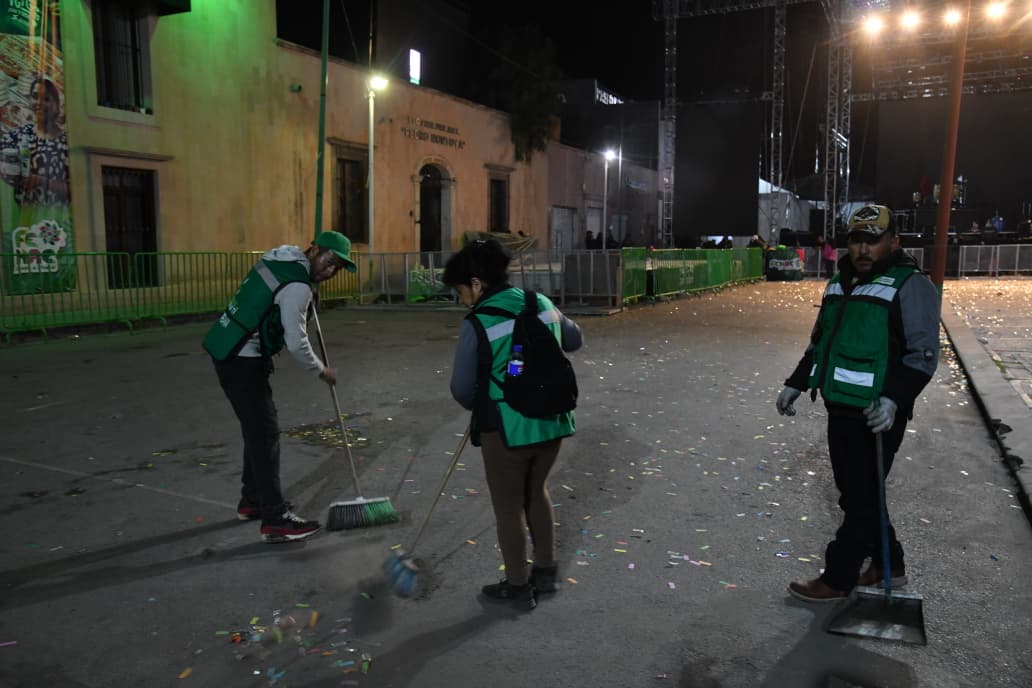 El director de Servicios Municipales, Antonio Zamarripa Quintero informó que se despliegan seis cuadrillas de barrido manual que operan en tres turnos continuos, desde las seis de la mañana hasta las tres de la madrugada, cubriendo recorridos permanentes durante toda la jornada. “Estamos trabajando en promedio arriba de cinco toneladas diarias; el sábado fueron 5.2 toneladas y el domingo 5.5 toneladas, atendiendo principalmente residuos de alimentos y apoyando a comerciantes para evitar la proliferación de contaminación”, detalló.