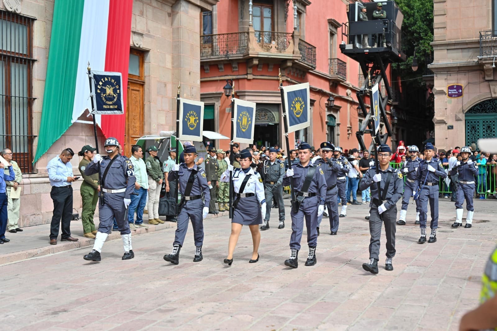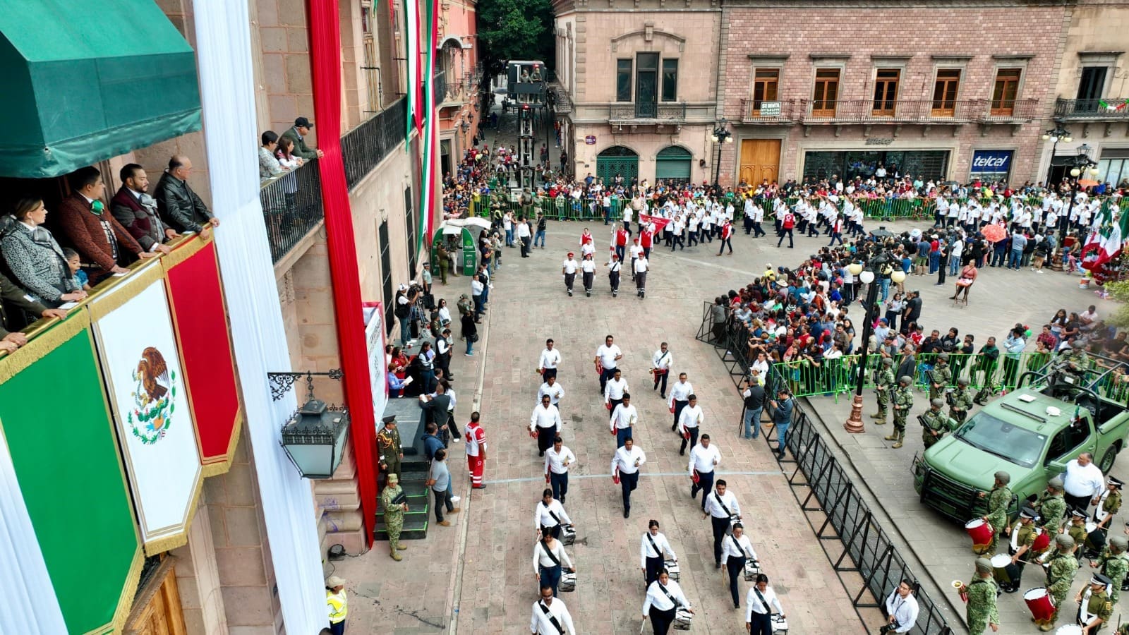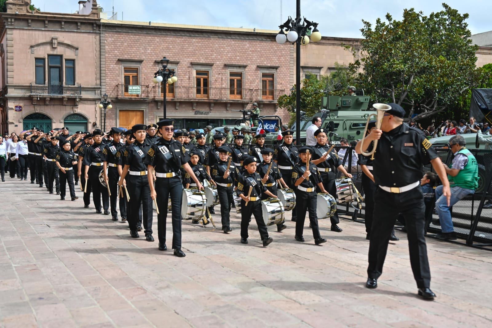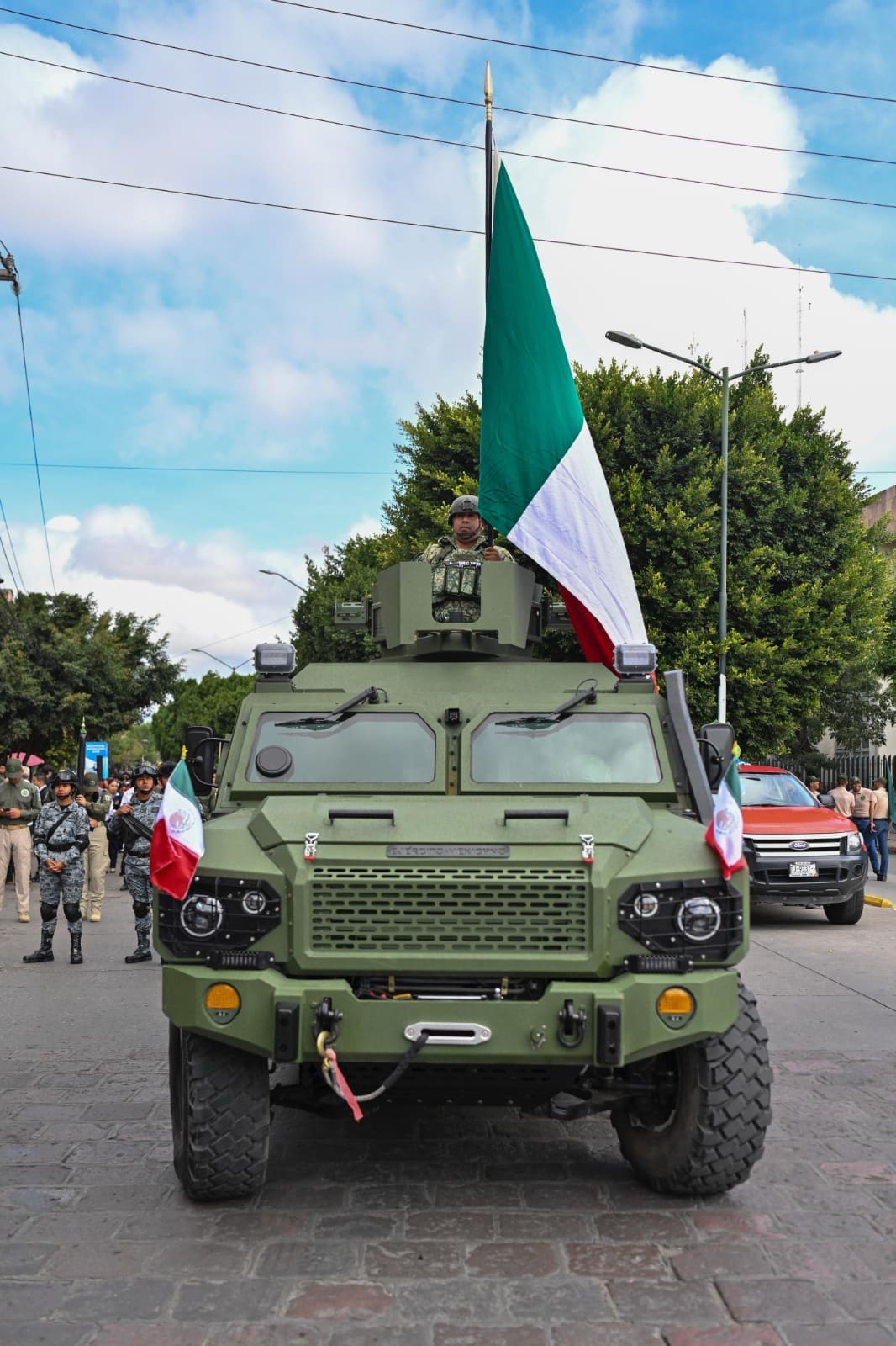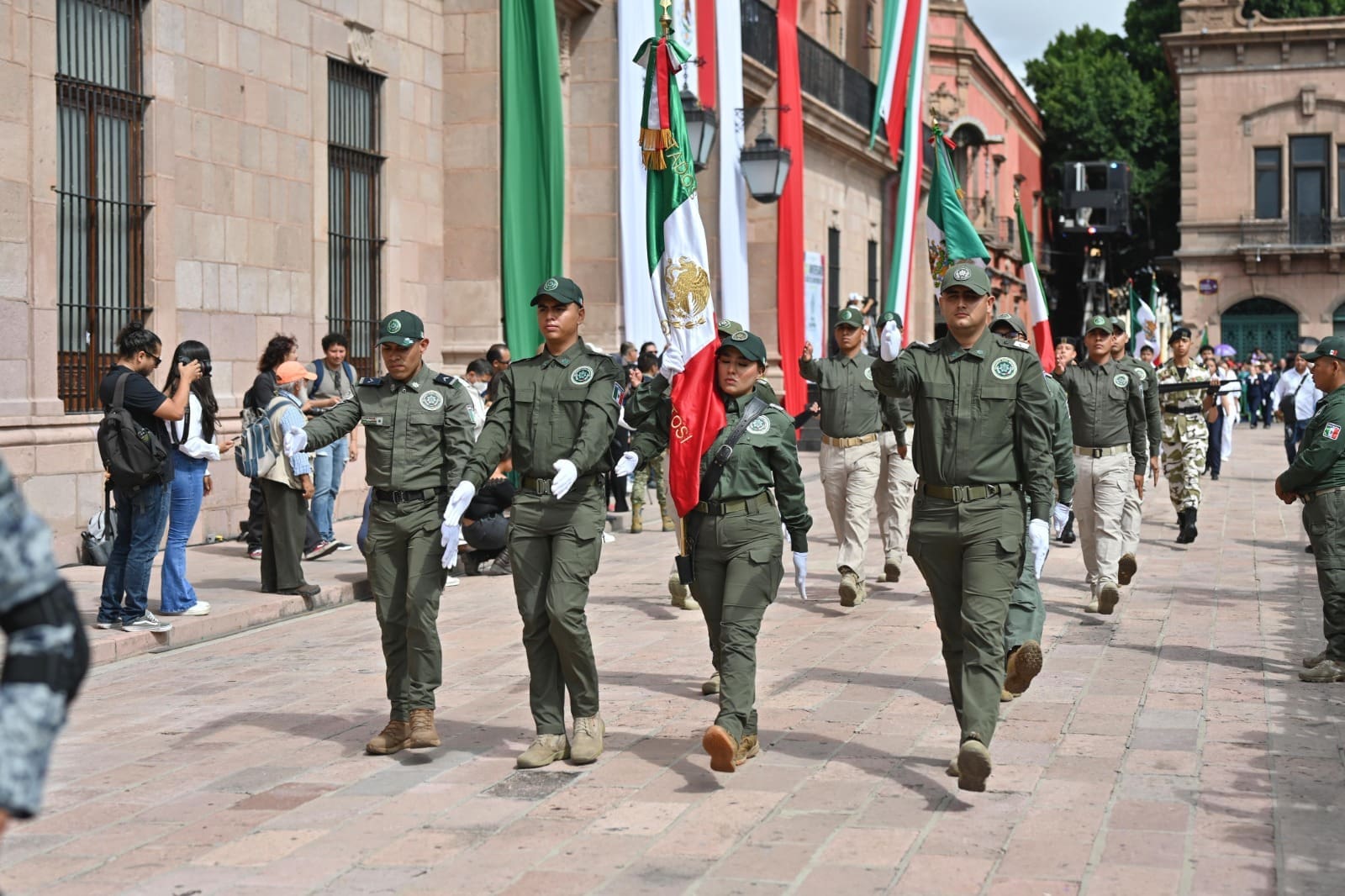 El desfile contó con la participación de las Fuerzas Armadas del Ejército, así como de la Guardia Civil Estatal, cuerpos de auxilio, instituciones educativas, trabajadores del Gobierno estatal, asociaciones de charros y civiles, quienes desfilaron entre aplausos y muestras de orgullo de las familias reunidas. Las y los asistentes destacaron la organización del evento y expresaron su reconocimiento a los contingentes por su disciplina, compromiso y entrega al servicio de la sociedad.
