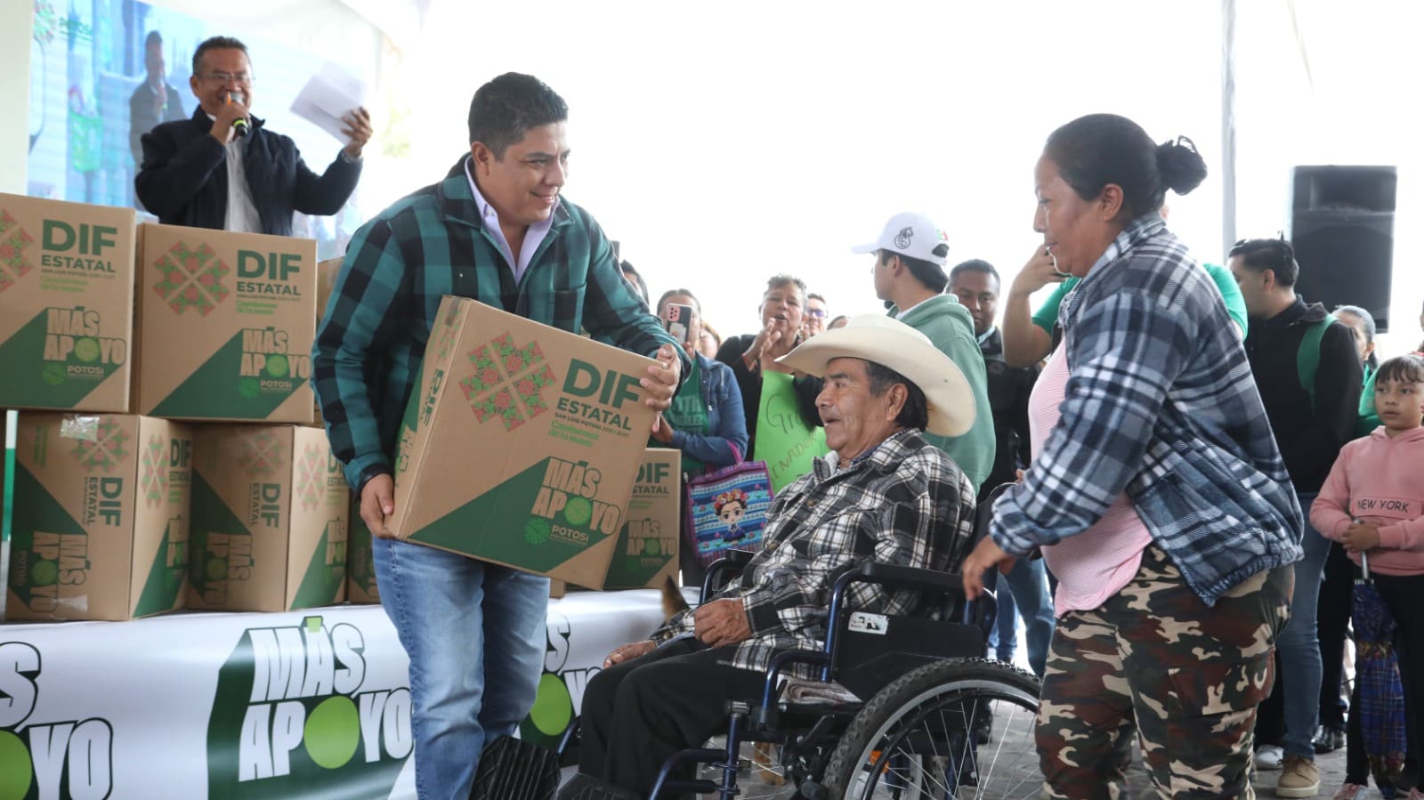 El Gobernador del Estado refrendó su compromiso para continuar acercando más apoyo a más de 500 mil hogares potosinos en todo el Estado para combatir el rezago alimentario, que en el caso de Zaragoza es del 22.2 por ciento de acuerdo con datos del Coneval, a través de mejores oportunidades de desarrollo con la garantía de que las infancias y las y los adultos mayores se nutrirán cada mes con productos como: leche, frijol, atún, aceite, frijol, café, cereal, arroz, galletas, entre otros.