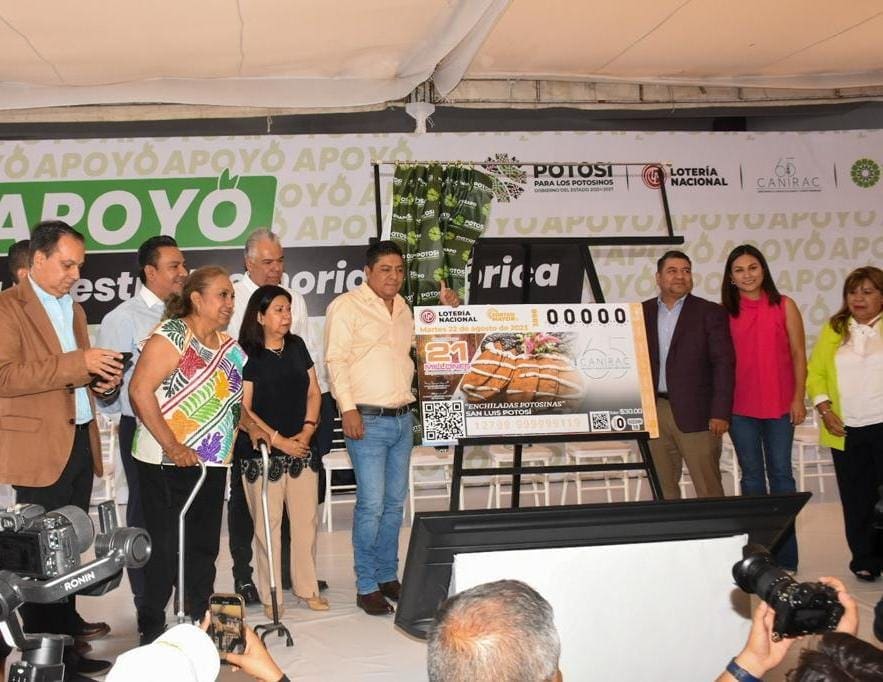 En el marco de la Fiesta de la Enchilada Potosina, en la que miles de personas de todas las edades degustaron este ícono y orgullo gastronómico de Soledad de Graciano Sánchez, la Alcaldesa, Leonor Noyola Cervantes, junto al Gobernador del Estado, Ricardo Gallardo Cardona y autoridades de diversos órdenes de gobierno, develaron el cachito de la nueva edición de la Lotería Nacional en que esta pieza culinaria es la imagen.