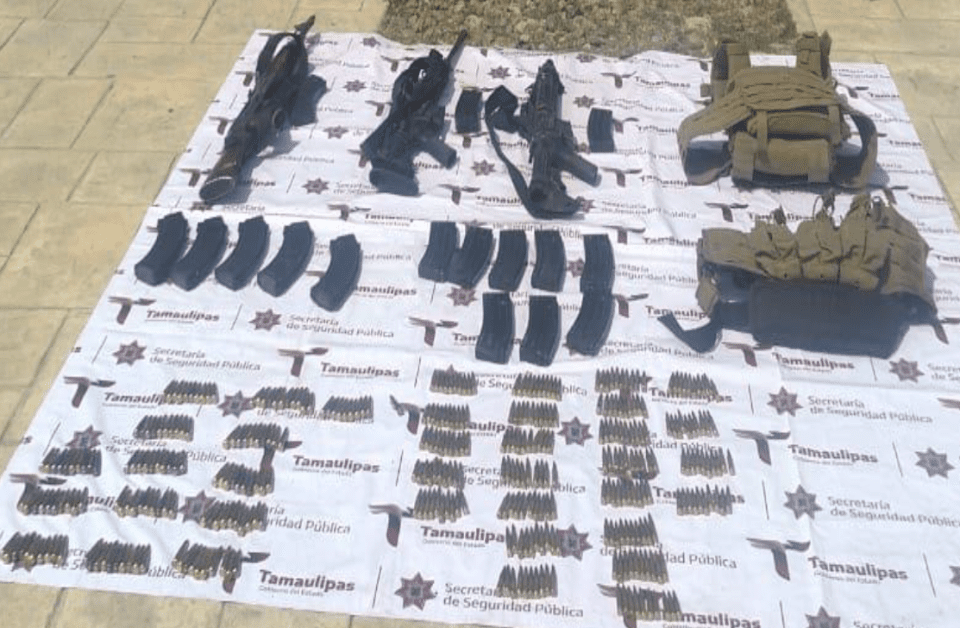 En Tamaulipas, elementos del Ejército Mexicano y Policía Estatal detuvieron a tres personas a bordo de una camioneta, asegurándoles tres armas largas, 16 cargadores, 380 cartuchos y dos chalecos tácticos