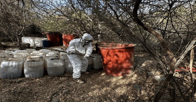 Se localizaron e inhabilitaron dos áreas de concentración de material diverso para la elaboración de drogas sintéticas, se aseguraron 4,200 litros y 3,550 kilos de sustancias químicas para la fabricación de sustancias ilícitas. La afectación económica a las organizaciones delictivas es de 167 millones de pesos.