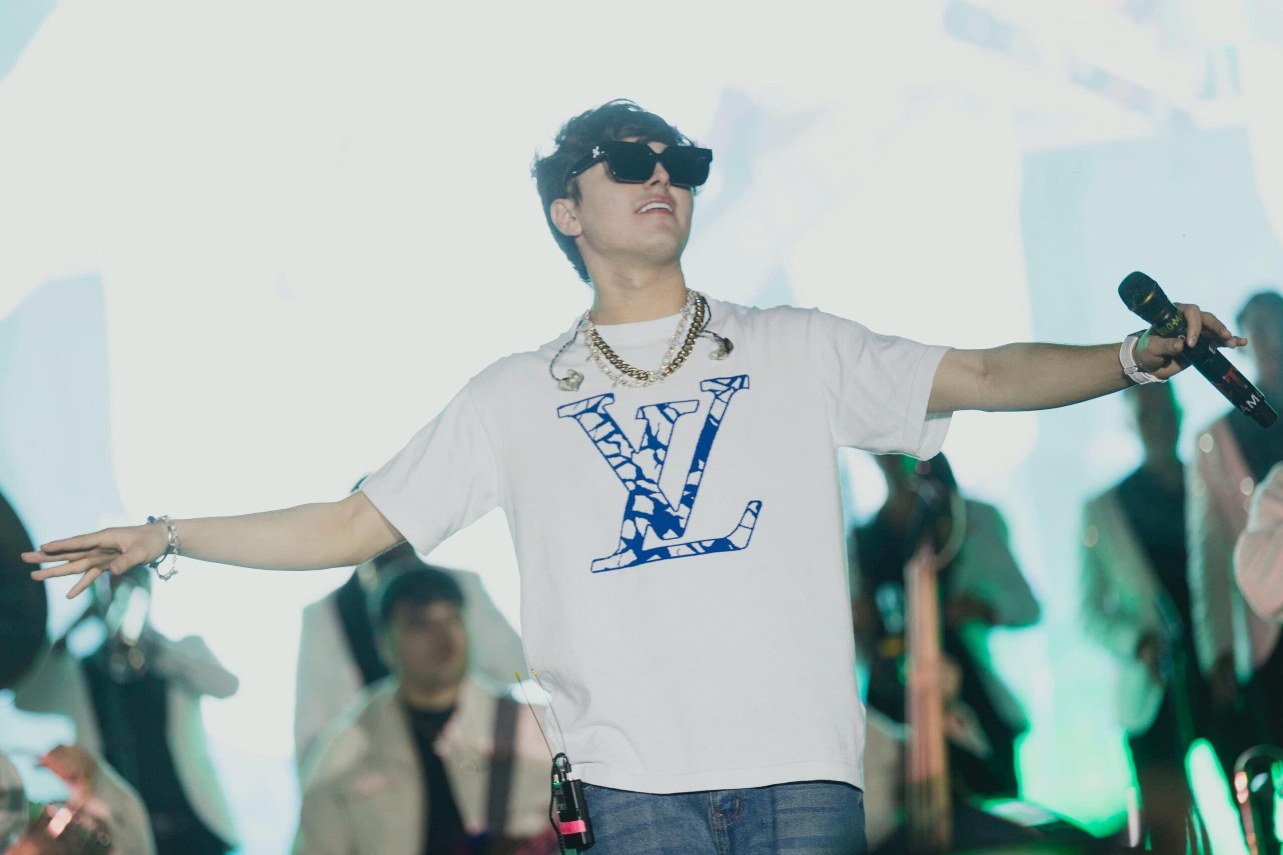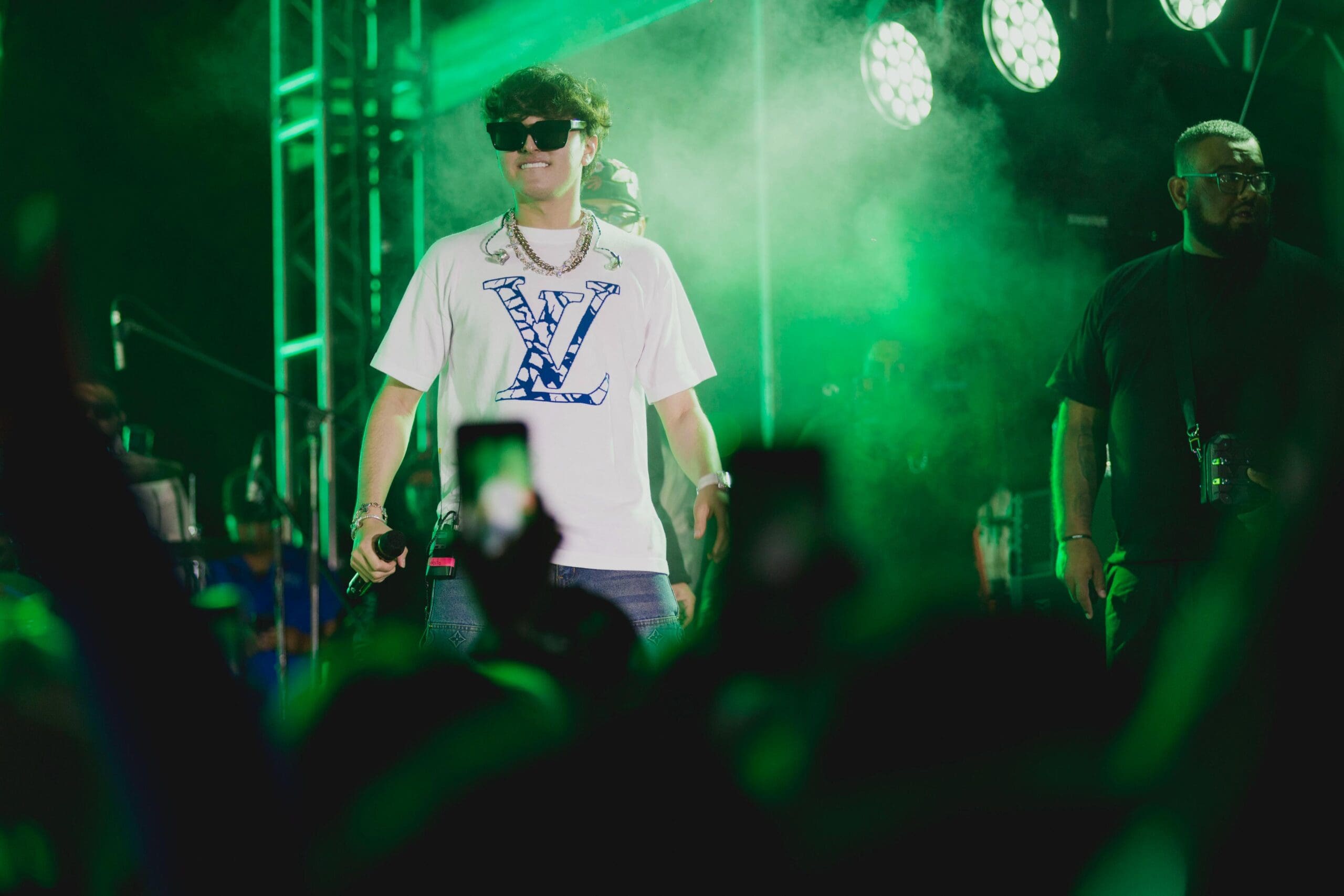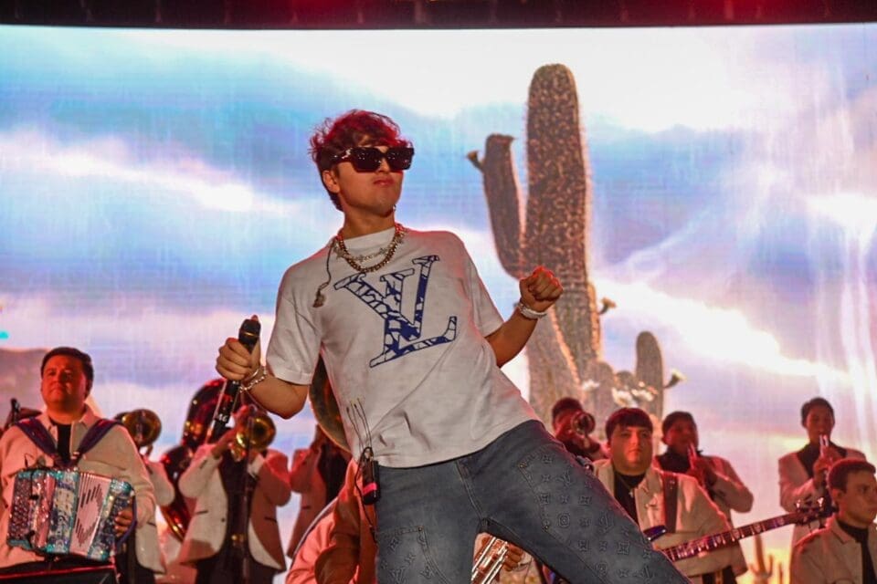 En punto de las 10 de la noche el joven cantante ingresó al escenario vestido con playera blanca, gafas oscuras y gruesas cadenas de plata alrededor de su cuello, acompañado de decenas de músicos, que pusieron a las y los asistentes a bailar a ritmo de banda con “El Muchacho Alegre” que de inmediato corearon las y los fanáticos.