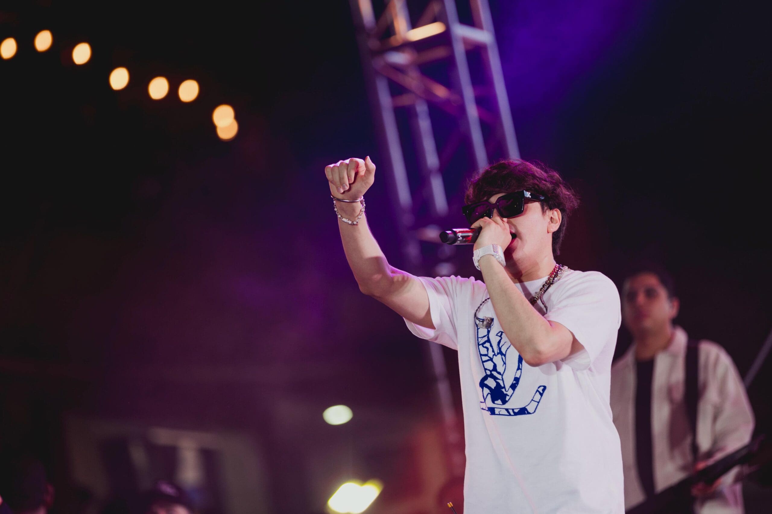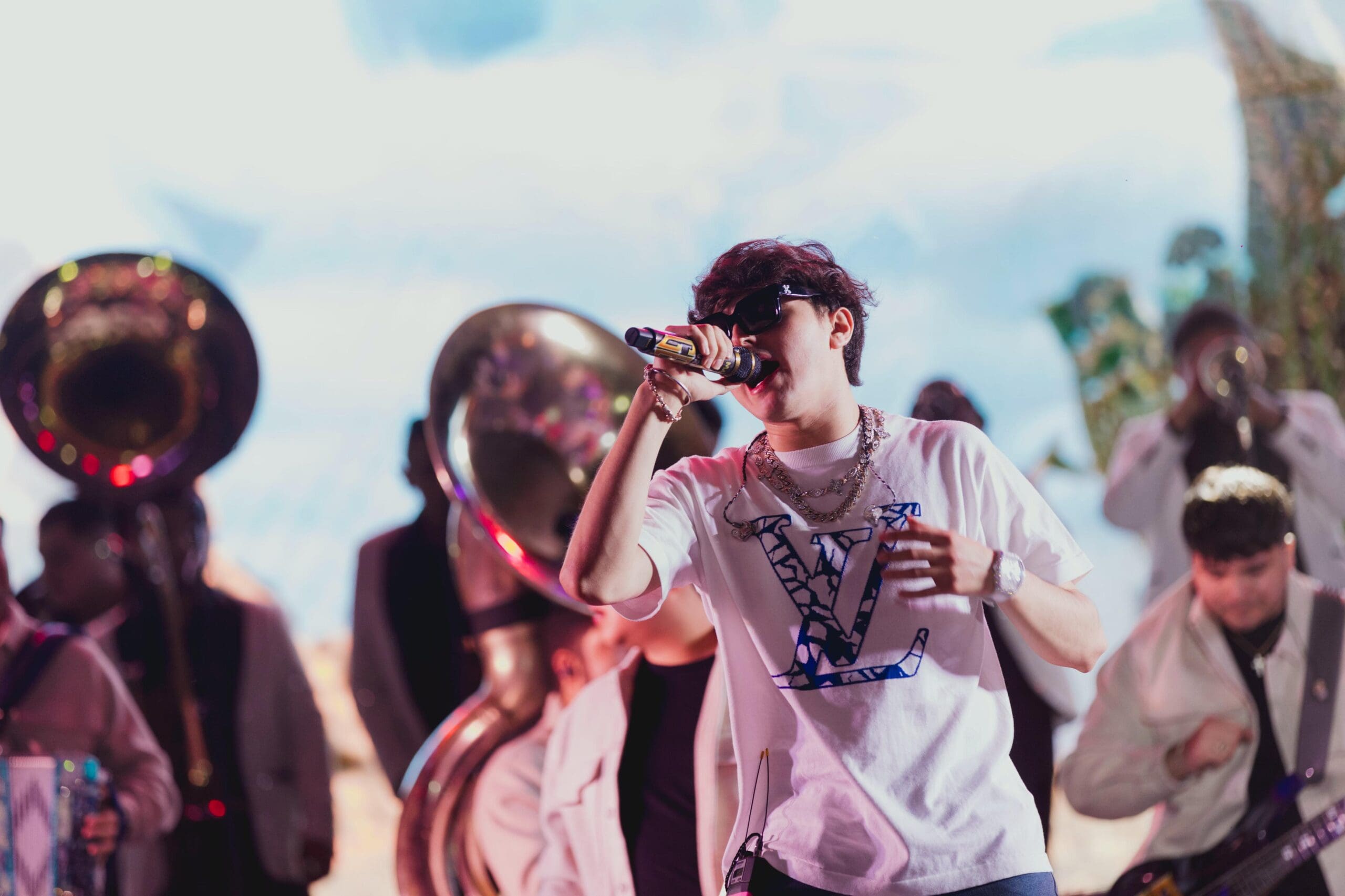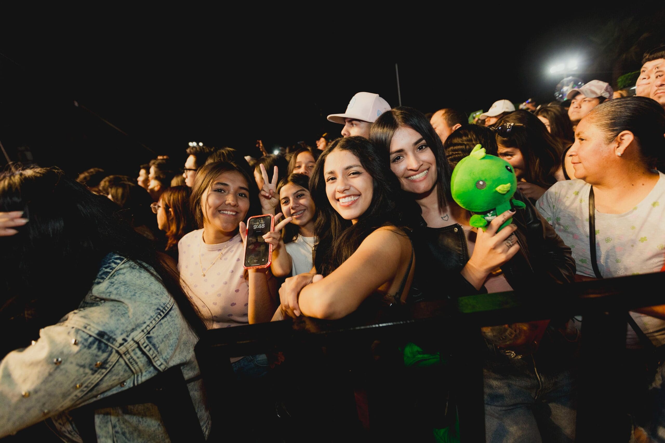 En punto de las 10 de la noche el joven cantante ingresó al escenario vestido con playera blanca, gafas oscuras y gruesas cadenas de plata alrededor de su cuello, acompañado de decenas de músicos, que pusieron a las y los asistentes a bailar a ritmo de banda con “El Muchacho Alegre” que de inmediato corearon las y los fanáticos.