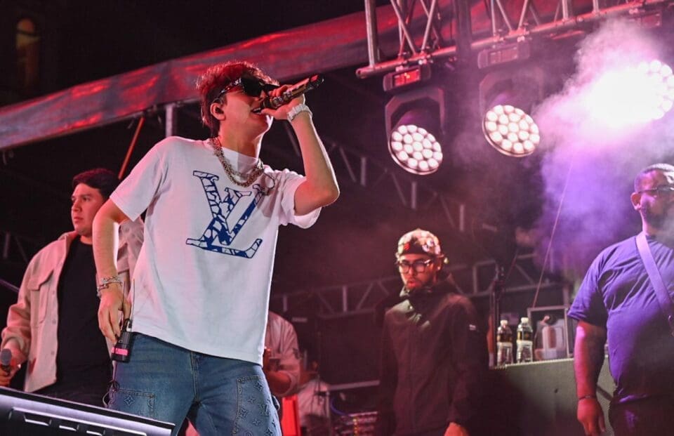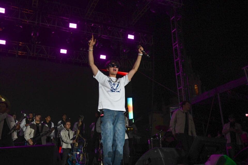 Posteriormente, el sonorense de 24 años de edad logró abarrotar la Plaza principal donde miles de decenas de jóvenes lo esperaban desde muy temprano, para corear sus populares corridos tumbados que lo han llevado a destacar en la escena musical en el género que ha crecido de forma imparable.