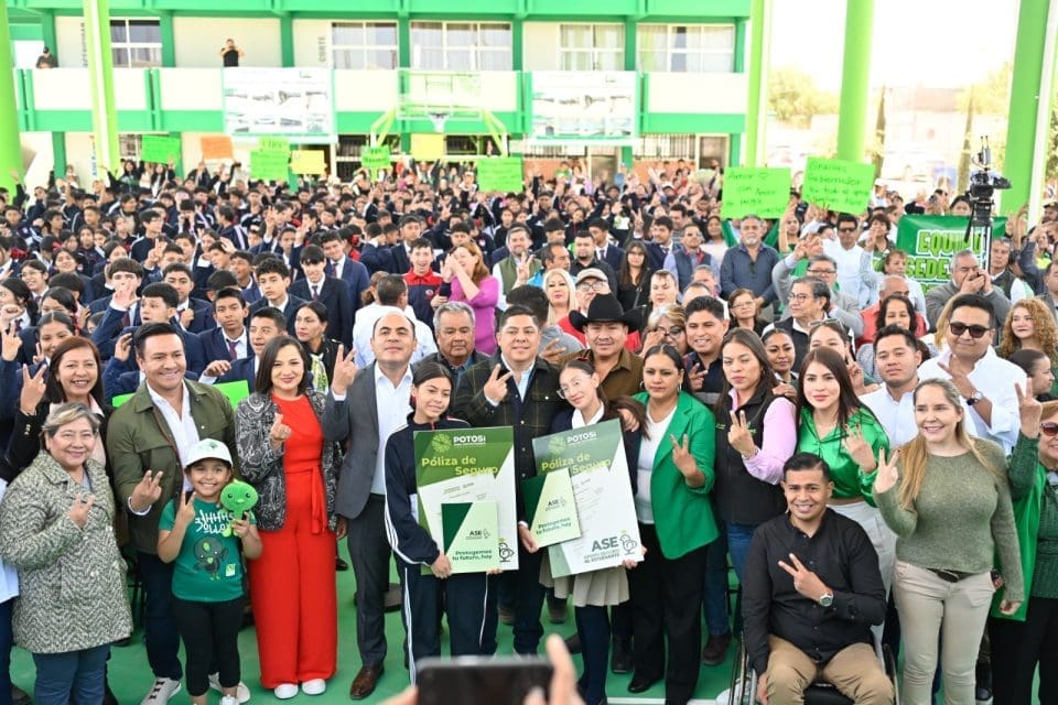Posteriormente, en Matehuala, donde fue recibido con el júbilo de estudiantes, funcionarios del gobierno municipal y ex alcaldes, el Gobernador Ricardo Gallardo entregó pólizas del seguro antes citado y el techado de la secundaria.