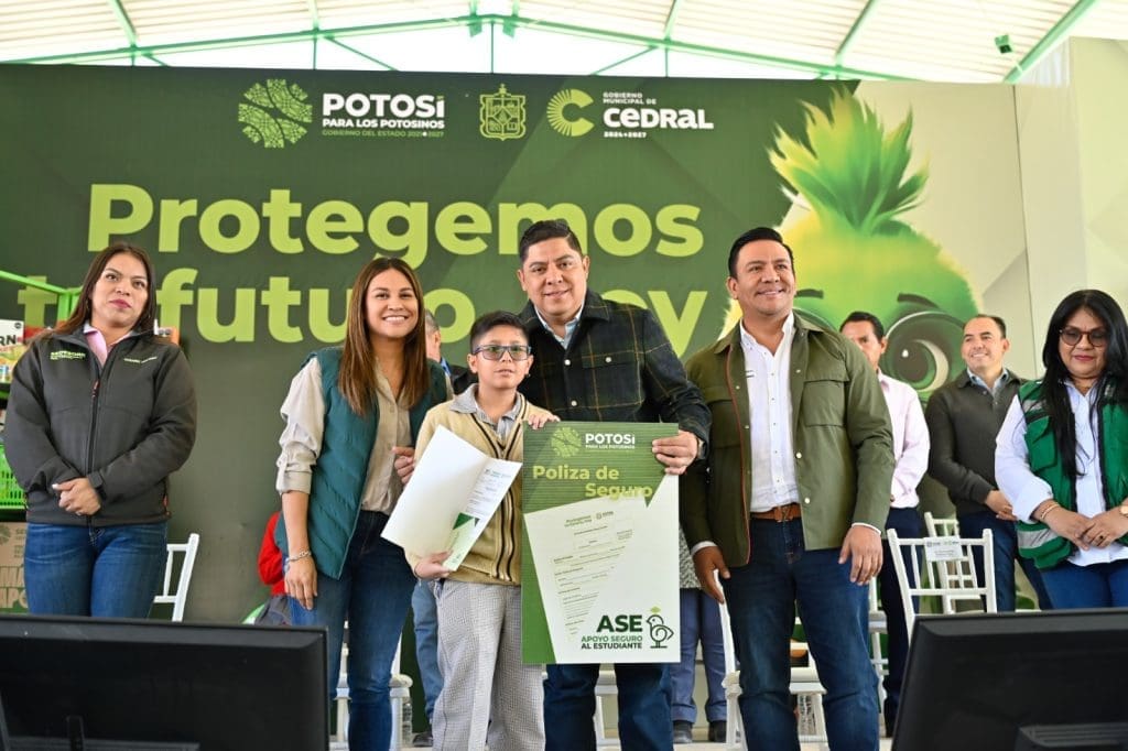 El Gobernador del Estado inauguró obras educativas en Cedral y Matehuala y entregó pólizas del programa Apoyo Seguro al Estudiante. En Cedral también brindó apoyos alimentarios, anunció la creación de una unidad deportiva y en Matehuala dijo que renovará el alumbrado público en toda la ciudad.