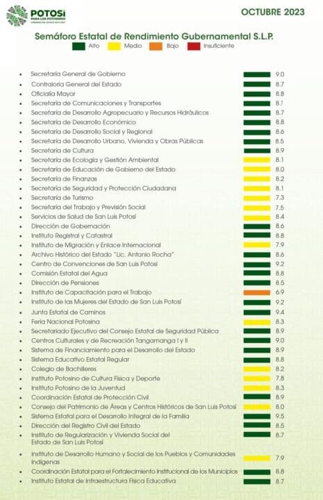 Este martes, el Gobernador del Estado de San Luis Potosí, Ricardo Gallardo Cardona, reveló los resultados del Semáforo Estatal de Rendimiento Gubernamental correspondientes al mes de octubre de 2023.