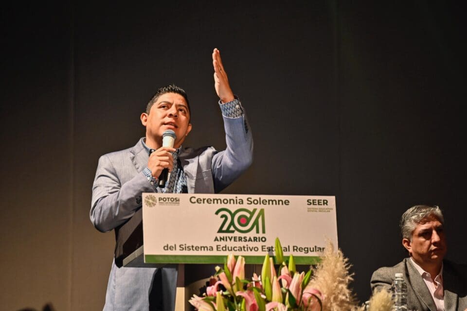 Al celebrar el 201 aniversario de la creación del Sistema Educativo Estatal Regular (SEER), el Gobernador de San Luis Potosí, Ricardo Gallardo Cardona reafirmó su compromiso con la educación y la infraestructura educativa tras resaltar que, con el apoyo del Estado, durante los próximos tres años creará mejores oportunidades para la niñez y la juventud potosina, a través de una educación integral, de calidad y de excelencia en las cuatro regiones.