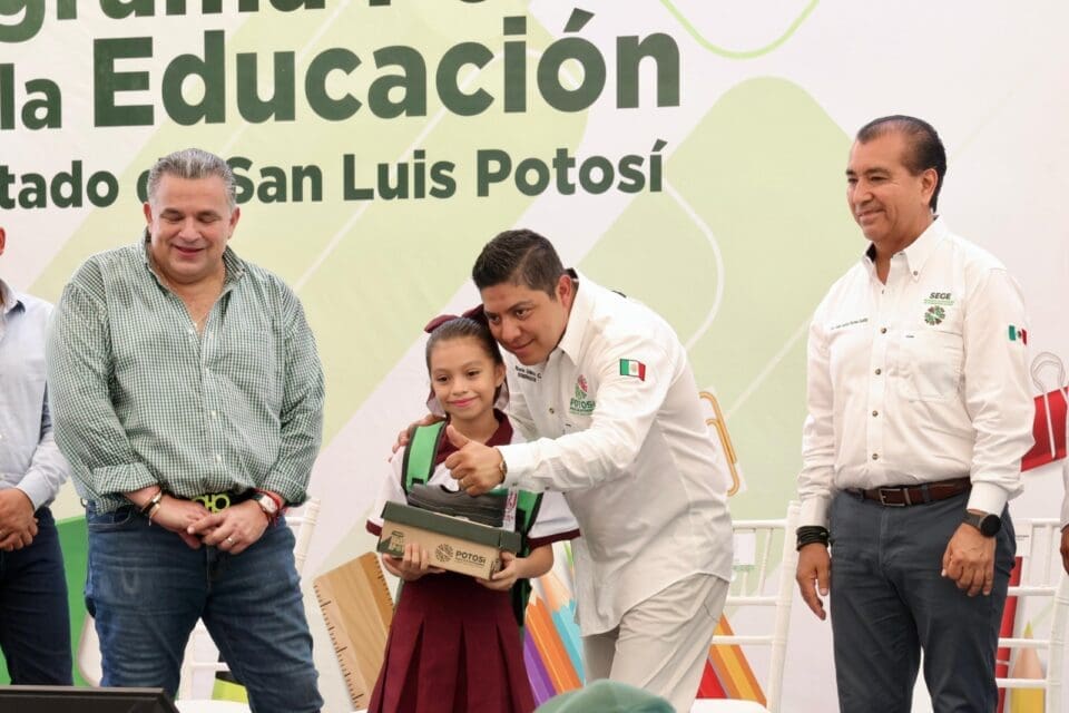 Destacó que por tercer año consecutivo su Gobierno entrega mochilas, útiles y zapatos a las y los estudiantes de preescolar, primaria y secundaria del sistema educativo estatal y federalizado, para que cuenten con las herramientas necesarias que los prepararán para cumplir sus sueños y que puedan ser parte del crecimiento que San Luis Potosí vive y vivirá en los próximos años.