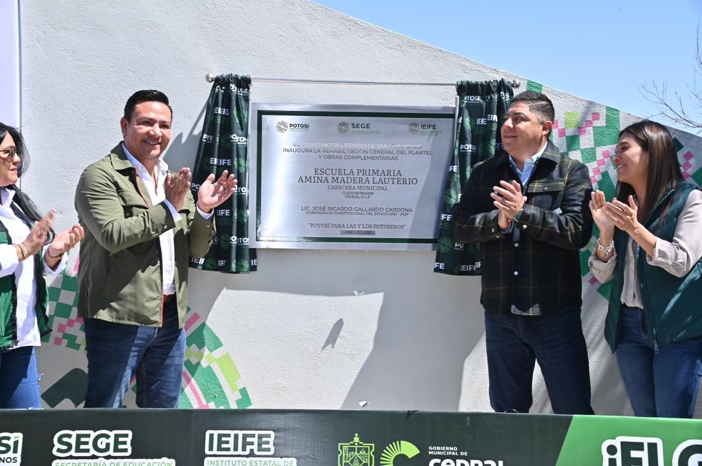 En lo que respecta al Altiplano, en Cedral, este año su Gobierno entregó completamente rehabilitada la primaria “Amina Madera Lauterio”, con cancha de futbol de pasto sintético, techado, nuevas aulas y mobiliario. En Matehuala, se construyó el techado de la secundaria “Prof. José Joel Tristán”, y en Venado, se inauguraron las modernas instalaciones de la preparatoria León García.