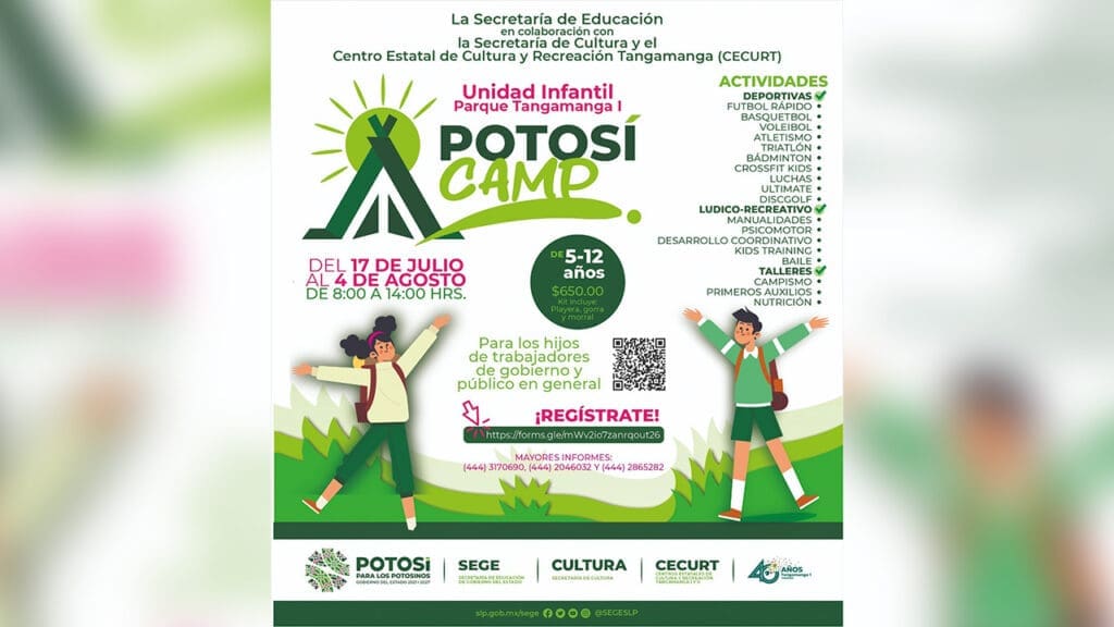 En apoyo al desarrollo integral de las y los niños potosinos, el Gobierno del Estado a través de las Secretarías de Educación de Gobierno del Estado (SEGE), de Cultura (Secult) y el Centro Estatal de Cultura y Recreación TANGAMANGA I y II (Cecurt), realizará el campamento de verano “Campamento Potosí”, dirigido a menores de 5 a 12 años, que se desarrollará en la Unidad Infantil del parque Tangamanga I, del 17 de julio al 4 de agosto con un horario de 8:00 a 14:00 horas de lunes a viernes.