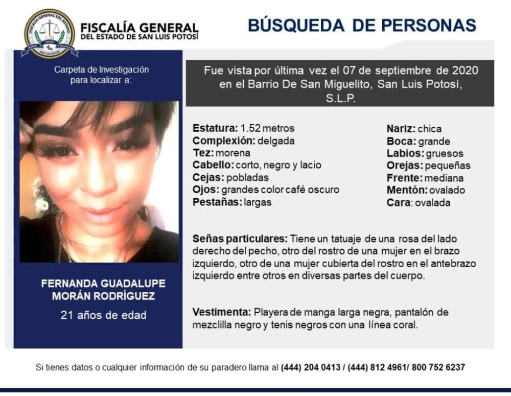 Fernanda tiene 21 años de edad, tiene un bebé pequeño que la espera en su casa, ubicada en la colonia Foresta, y el día de su desaparición, llevaba puestos una playera y unos jeans color negro, además de zapatos negros con una línea color coral.