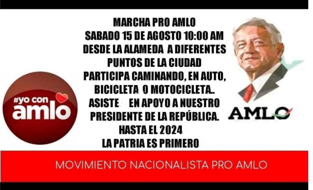 Como una contraparte al grupo FRENA, que pide la destitución de López Obrador, como Presidente de México, el colectivo Movimiento Nacionalista Pro-AMLO, llevará a cabo una marcha en apoyo al mandatario federal, este 15 de agosto, en calles del Centro Histórico.