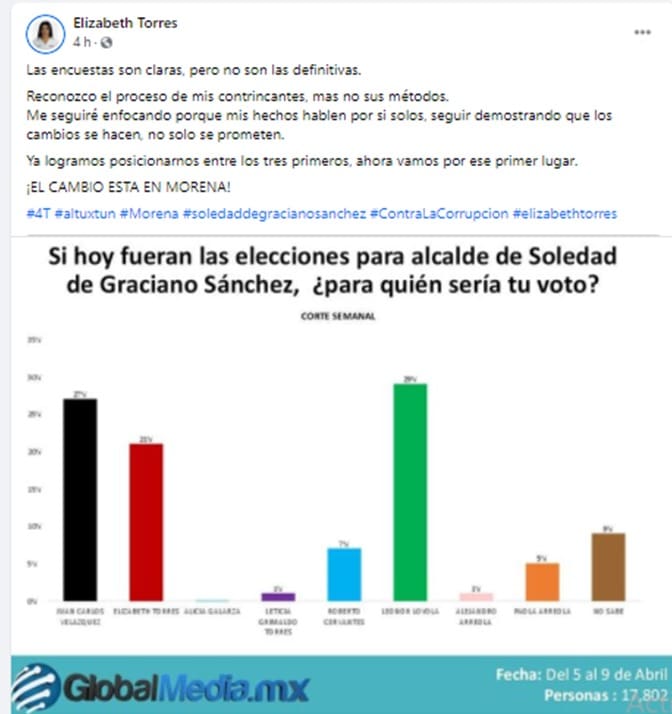 Con una publicación en su red de Facebook, la joven aspirante compartió los resultados de una encuesta digital realizada por un medio local, que la posiciona en el penoso tercer lugar de las preferencias; adelante de ella, se coloca la candidata del Partido Verde y Partido del Trabajo, Leonor Noyola Cervantes.