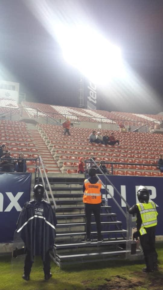 Como es costumbre, en cada partido de fútbol llevado a cabo en el Estadio potosino, se implementan operativos de seguridad para resguardar la integridad de los asistentes y prevenir situaciones de riesgo a terceros, debido a conflictos entre porras o accidentes comunes. El día de ayer, se llevó a cabo el encuentro deportivo entre equipos femeniles del Atlético y el Club León, también se instaló el operativo de seguridad, pero destacó la usencia de aficionados, aun asi, los ¡oficiales de la Policía Estatal permanecieron de pie frente a butacas vacías!