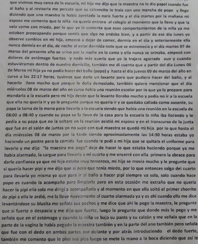 La madre de la menor violentada, explicó que en el 8 de marzo del año 2017, su hija tenía 5 años de edad, estudiaba en el Colegio Luis Gonzaga Urbina, en el municipio de Rioverde, y un día la pequeña le relató que su maestra la había golpeado en el estomago, senos y partes íntimas, además de introducirle el dedo por adelante y por atrás.