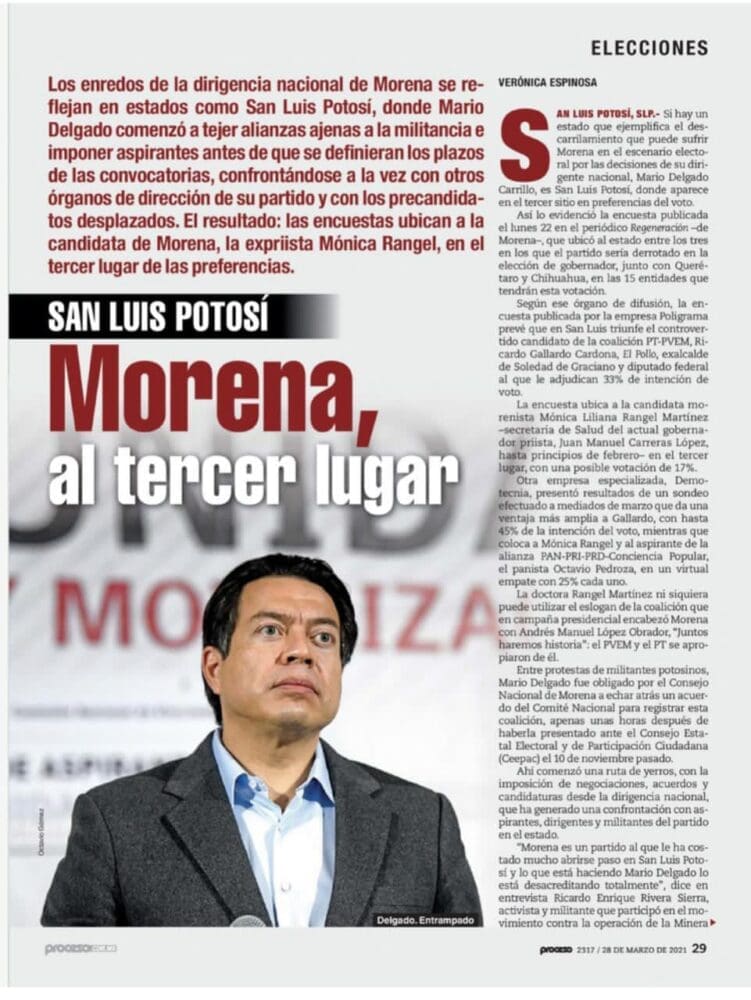 De acuerdo a los datos vertidos y confirmados por la encuestadora, publicados este domingo por la revista de circulación nacional, PROCESO, Gallardo Cardona tiene el 33.23% de las preferencias ciudadanas para ser el gobernador de San Luis Potosí, mientras que Octavio Pedroza, de la coalición PRI-PAN-PRD-CP, iría en segundo lugar con el 26.55% de la elección; mientras que, el tercer lugar es ocupado por la expriista y exsecretaria de Salud, Mónica Liliana Rangel, con apenas el 17.01%.