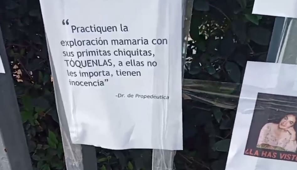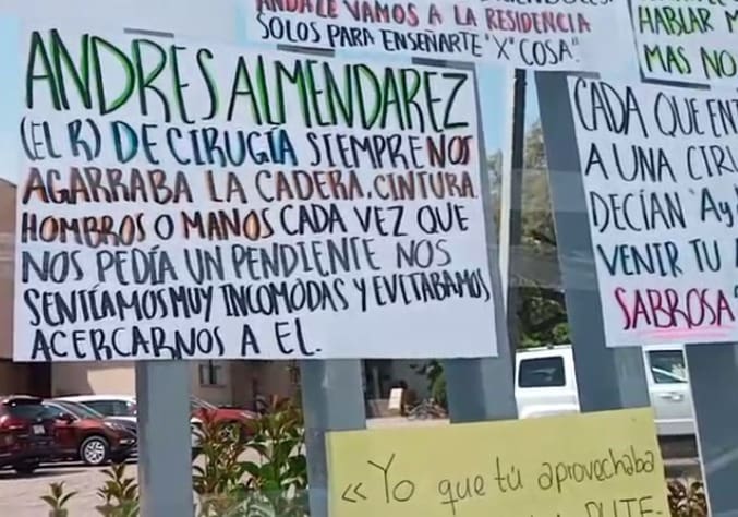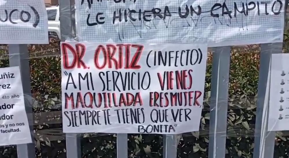 Entre las denuncias exhibidas, se encuentran algunas por parte de alumnas que realizan su residencia en hospitales públicos y en la misma Facultad; también exhibieron a compañeros alumnos, de agredirlas simbolicamente.