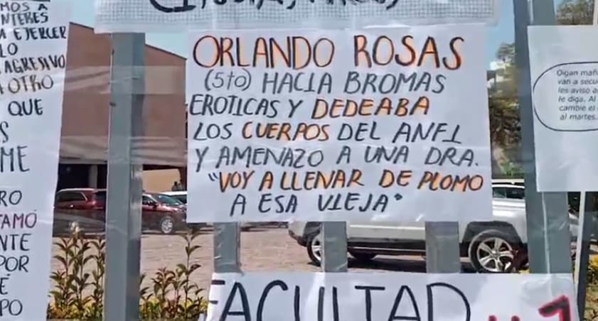Una lona enorme, también acompaña esta manifestación, en la que se pide al director de la Facultad, Alejandro Javier Zermeño, de no encubrir » a los acosadores», cutos nombres aparecen plasmados.