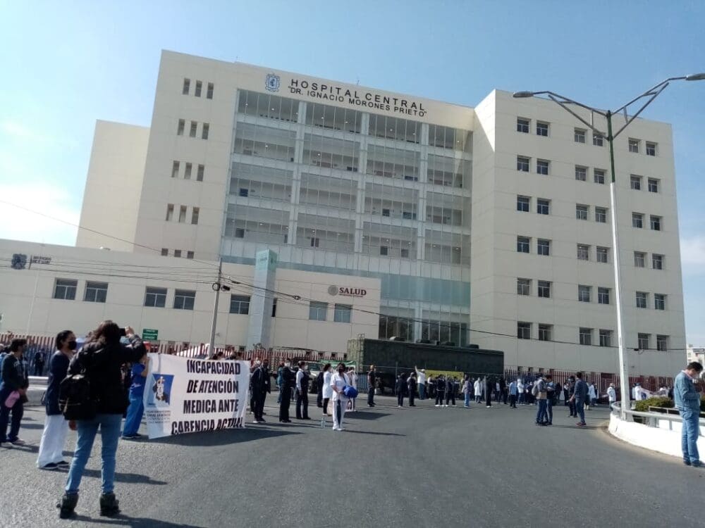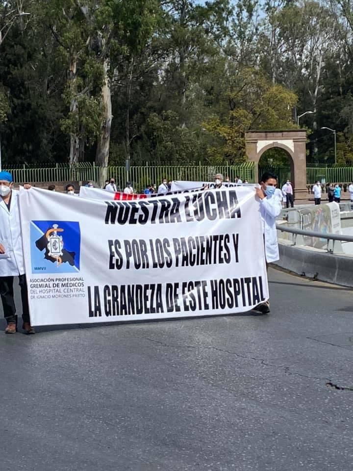 La mañana de este día, centenas de médicos, enfermeros y personal que labora en diversas áreas del Hospital Central «Dr. Ignacio Morones Prieto», salieron de sus zonas de trabajo, para realizar una valla humana en toda la Glorieta González Bocanegra, para suplicar por insumos, medicamentos, personal humano y hasta por jeringas y agujas.
