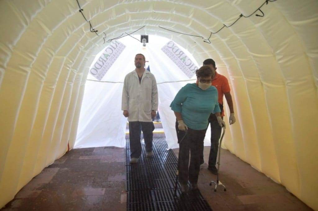 Esta estructura ayudará a desinfectar hasta a 20 personas al mismo tiempo, al momento de ingresar y salir de las instalaciones del Hospital, eliminando el 99.9% de bacterias que las personas lleven consigo.