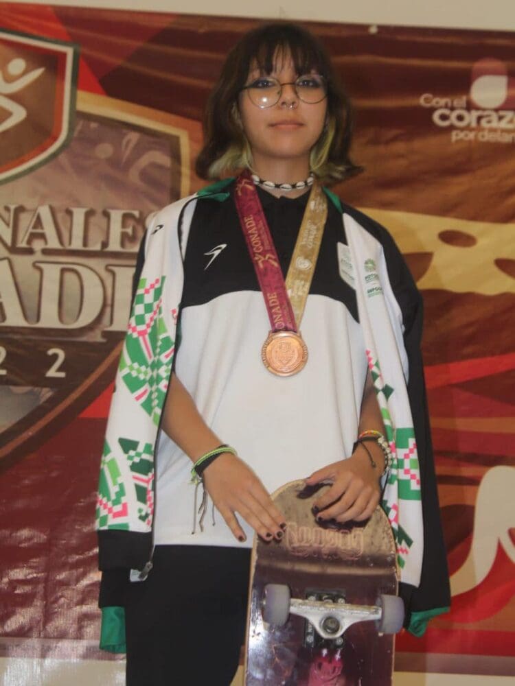 El funcionario destacó que en un hecho histórico, San Luis Potosí obtuvo presea de bronce en skateboarding, en el primer año en que este deporte es incorporado a los Juegos Nacionales, gracias al esfuerzo de la patinadora Camila Sarai Ibarra Tejada, quien compitió en modalidad de bowl con tres rutinas de 45 segundos cada una, y en la que los jueces dieron una calificación de 1.20.