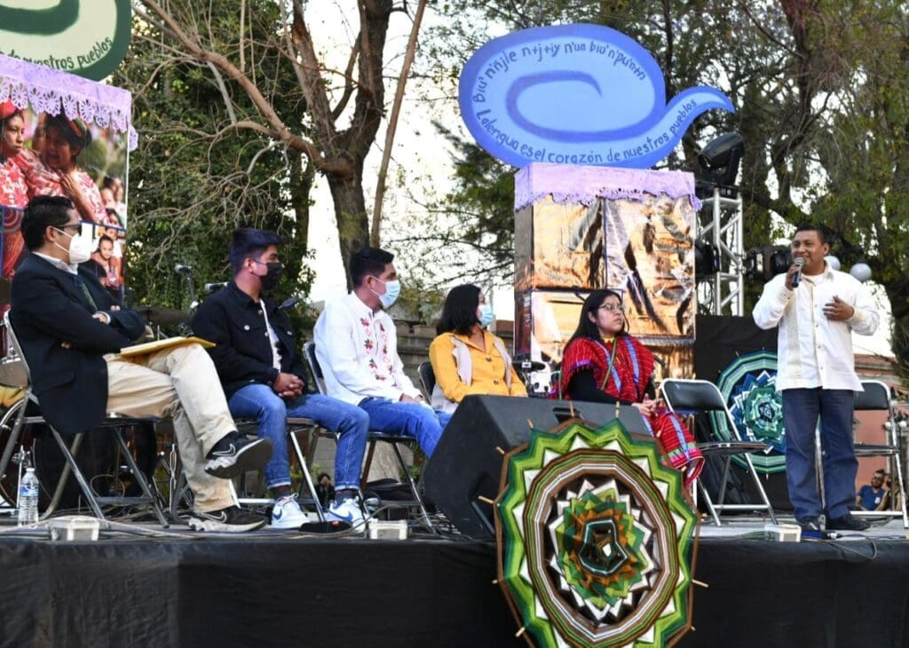 A las 18:00 horas comenzó una mesa de reflexión con jóvenes hablantes de lenguas originarias entre tének, náhuatl, triqui y español, donde abordaron temas como la diversidad lingüística, escenarios creativos, herramientas comunicativas y otros más.