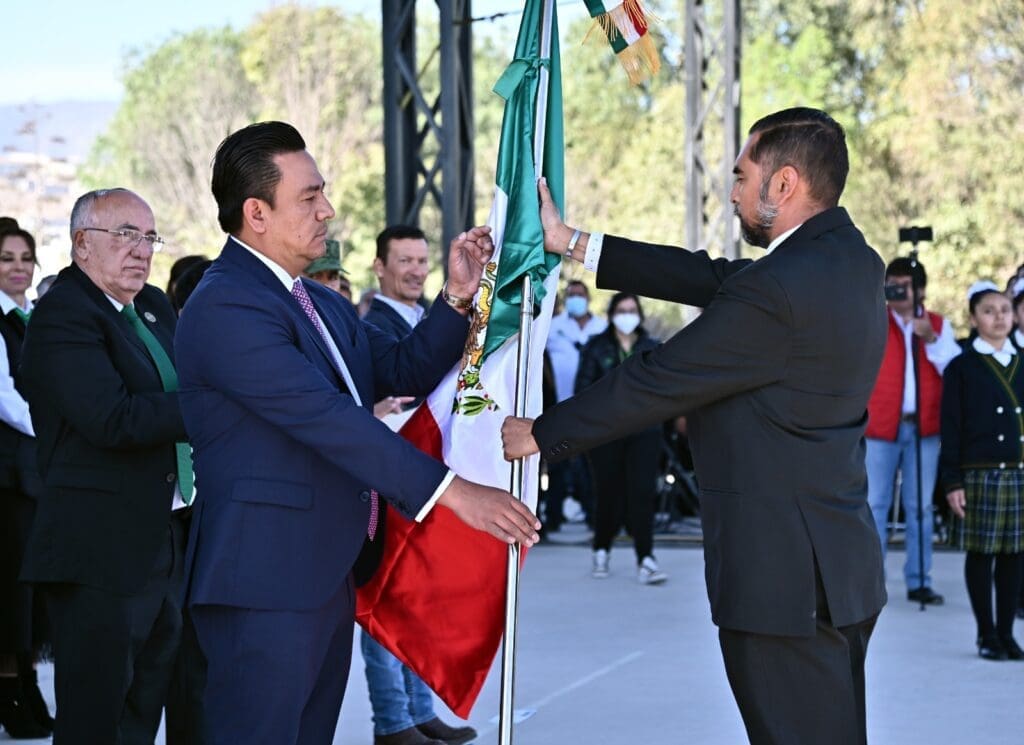 Recordó que en la Bandera y en los símbolos patrios se encuentran el talento de potosinos valiosos como Francisco Eppens Helguera, quien diseñó el escudo nacional, y de Francisco González Bocanegra y Julián Carrillo, autores de las letras del Himno Nacional Mexicano y el Canto a la Bandera.