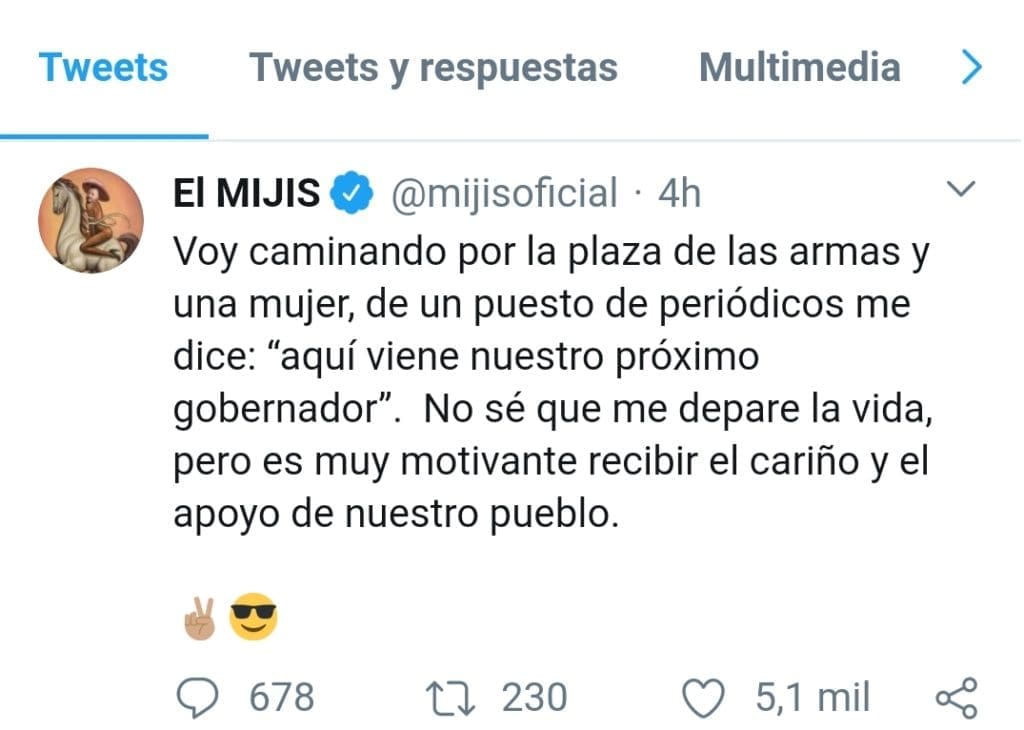 El diputado Pedro César Carrizales «El Mijis», presumió en su cuenta de Twitter, el que una mujer le haya gritado «ahí viene nuestro próximo Gobernador», situación que se la tomó en serio y decidió presumirlo en sus redes sociales.