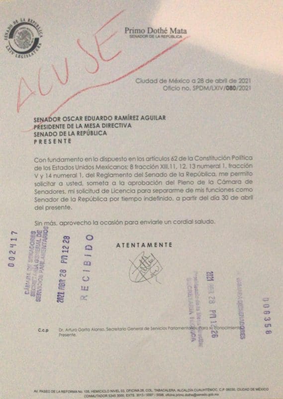 Este jueves, el Senador de MORENA, Primo Dothé Mata, pidió licencia a su cargo, lo cual surte efecto a partir de mañana, viernes 30 de abril. De acuerdo a los primeros rumores, el político huasteco suplirá a la doctora Mónica Rangel como candidato a la gubernatura.