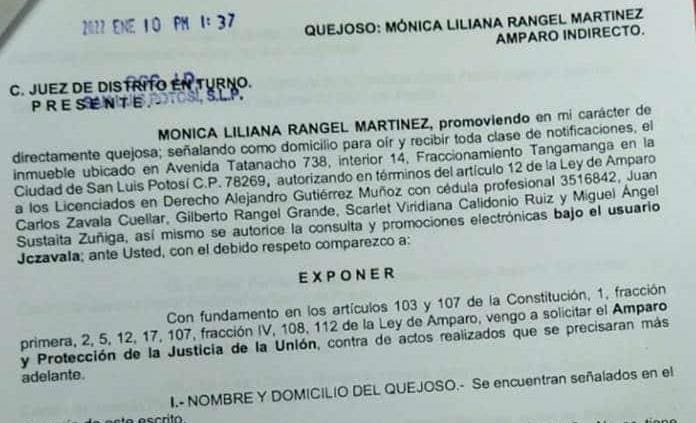 El amparo interpuesto por la exfuncionaria en el gobierno de Juan Manuel Carreras López, fue presentado el pasado 7 de enero, y en él se solicita protección ante cualquier orden de aprehensión del ramo penal por parte de jueces de control de la capital, Matehuala y Ciudad Valles. Pide que se prevalezca la presentación de documentos de sustento y motivación de procedimiento legal.