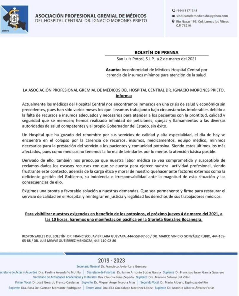 «Los médicos del Hospital Central nos encontramos inmersos en una crisis de salud y económica sin precedentes, pues han sido varios meses los que llevamos trabajando bajo circunstancias intolerables, debido a la falta de recursos e insumos adecuados y necesarios», es la frase con la que inicia un comunicado de la Asociación Gremial de Médicos del Hospital Central Dr. Ignacio Morones Prieto, denunciando las peores condiciones de trabajo de los últimos tiempos.