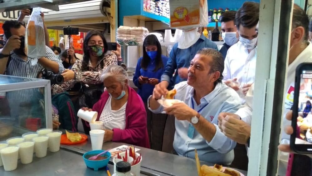 Octavio Pedroza Gaitán, acompañado de Enrique Galindo Ceballos, ambos candidatos de la coalición «del diablo» entre PRI-PAN-PRD-CP, llegaron, esta mañana, a los estrechos pasillos del Mercado República, lo que ocasionó que los comerciantes mostraran su disgusto.