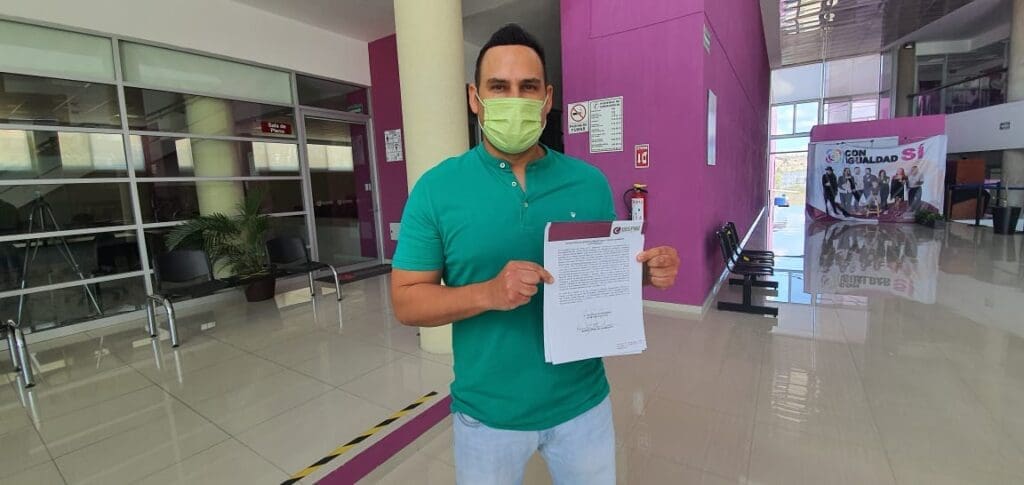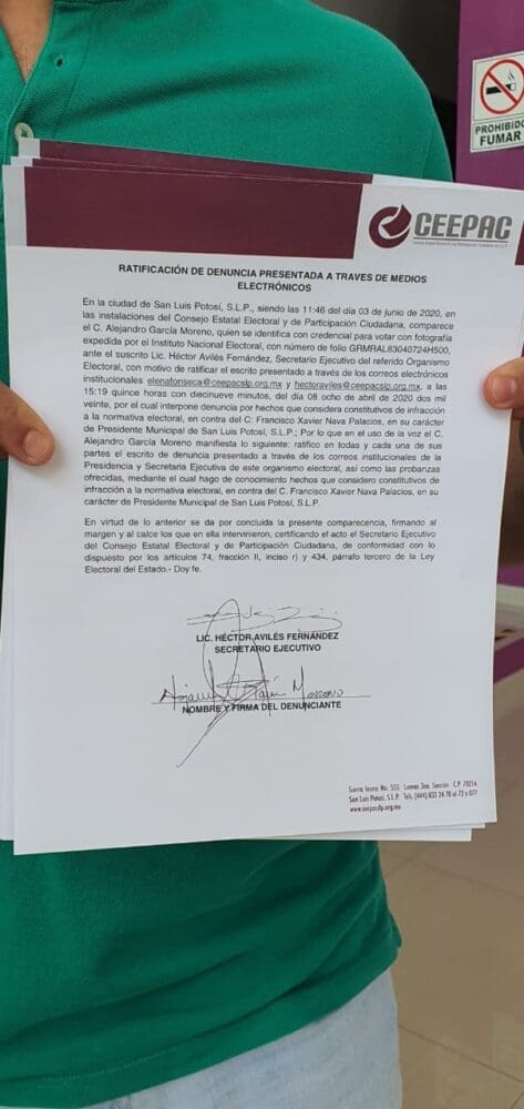 Los dirigentes de los Comités Estatales de los partidos Verde Ecologista y de la Revolución Democrática, Alejandro García Moreno y Jesús Barajas Ábrego, respectivamente, se presentaron en el CEEPAC, con el fin de ratificar las denuncias interpuestas en contra de Xavier Nava Palacios, alcalde de la Capital, por promoción personalizada.