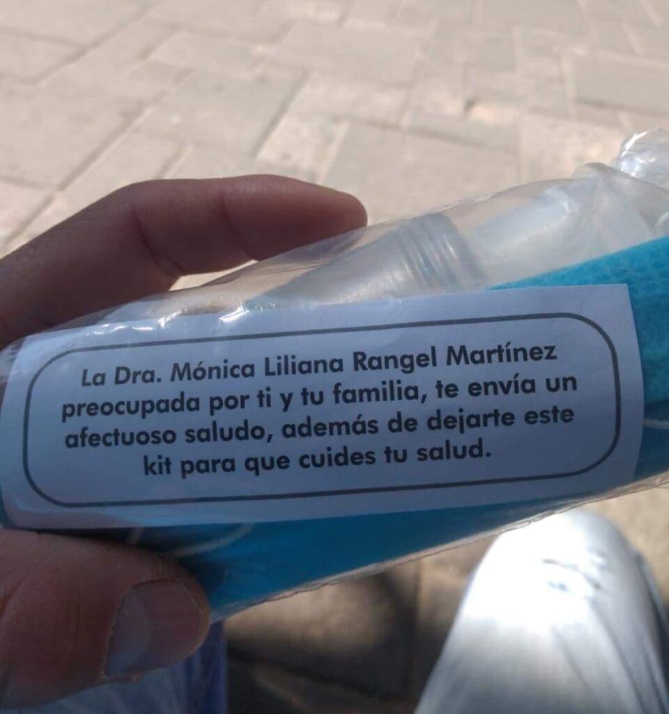 Hace días, este grupo de personas en las calles, fueron vistas en Barrio de San Miguelito, por los rumbos de la Calzada de Guadalupe. El kit se conforma de cubrebocas y un recipiente con gel antibacterial, además de una etiqueta adherible con un mensaje, presuntamente, de Liliana Rangel Martínez.