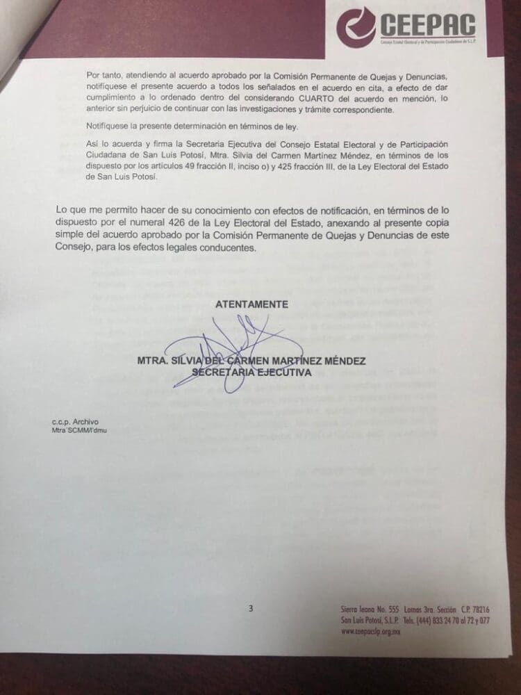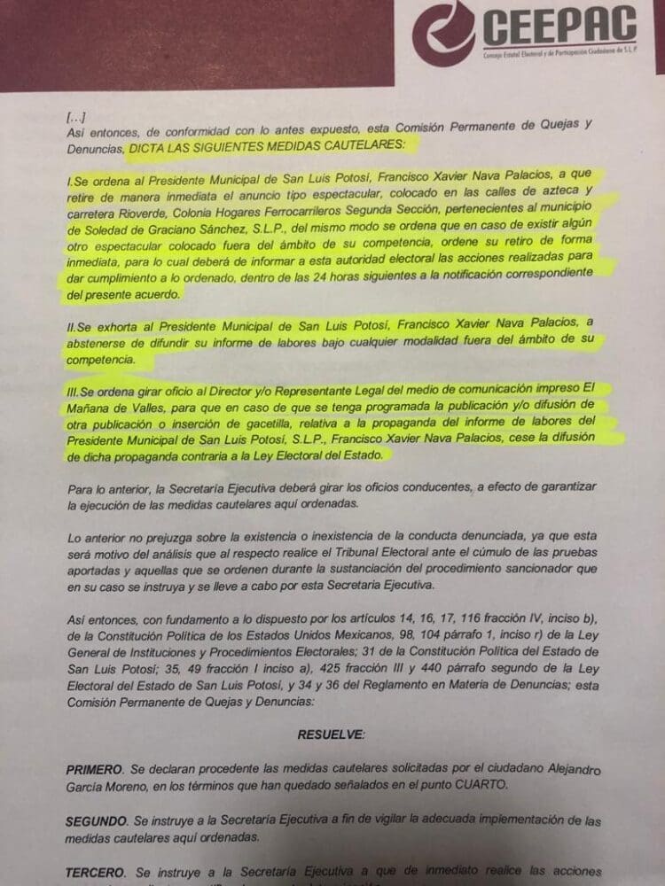 Así mismo, el CEEPAC ordenó al medio del municipio de Ciudad Valles, paralizar la difusión de cualquier publicación, inserción o gacetilla, relativa a la propaganda del segundo informe de Nava Palacios.