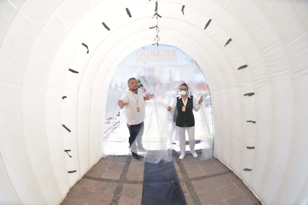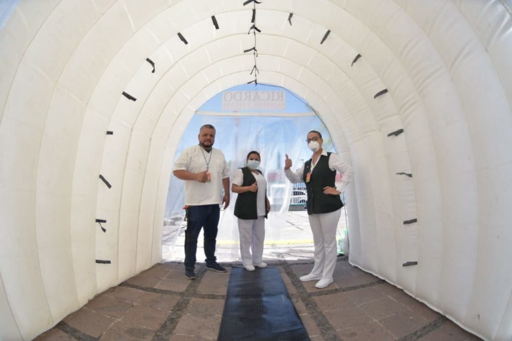 El túnel es un módulo inflable portátil que cuenta con un sistema de aspersión de líquido sanitizante, capaz de eliminar el 99.9 por ciento de virus, bacterias y hongos, además de que puede desinfectar un promedio de 20 personas por minuto en pasos transitorios de alto flujo de personas.