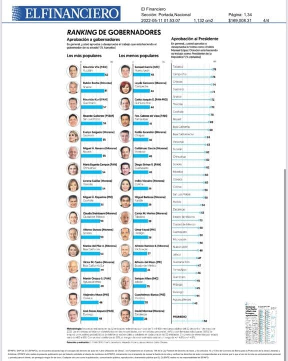 Ricardo Gallardo Cardona, mandatario de San Luis Potosí, se sitúa en la posición número cuatro del ranking nacional de gobernadores con una aprobación del 56% de la población, según los resultados de la encuesta telefónica realizada por el diario El Financiero, durante el mes de abril de 2022.