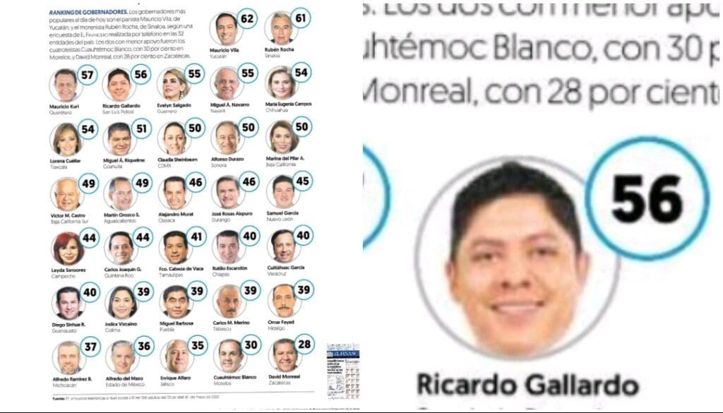 Ricardo Gallardo Cardona, mandatario de San Luis Potosí, se sitúa en la posición número cuatro del ranking nacional de gobernadores con una aprobación del 56% de la población, según los resultados de la encuesta telefónica realizada por el diario El Financiero, durante el mes de abril de 2022.