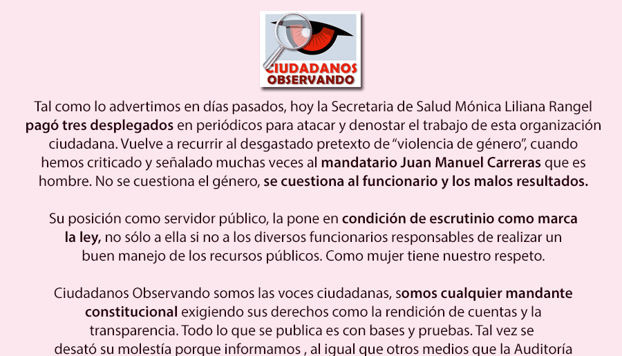 La Organización Ciudadanos Observando, emitió una postura al desplegado publicado por la secretaria de Salud, Mónica Liliana Rangel Martínez, en 3 medios impresos, el día de hoy.