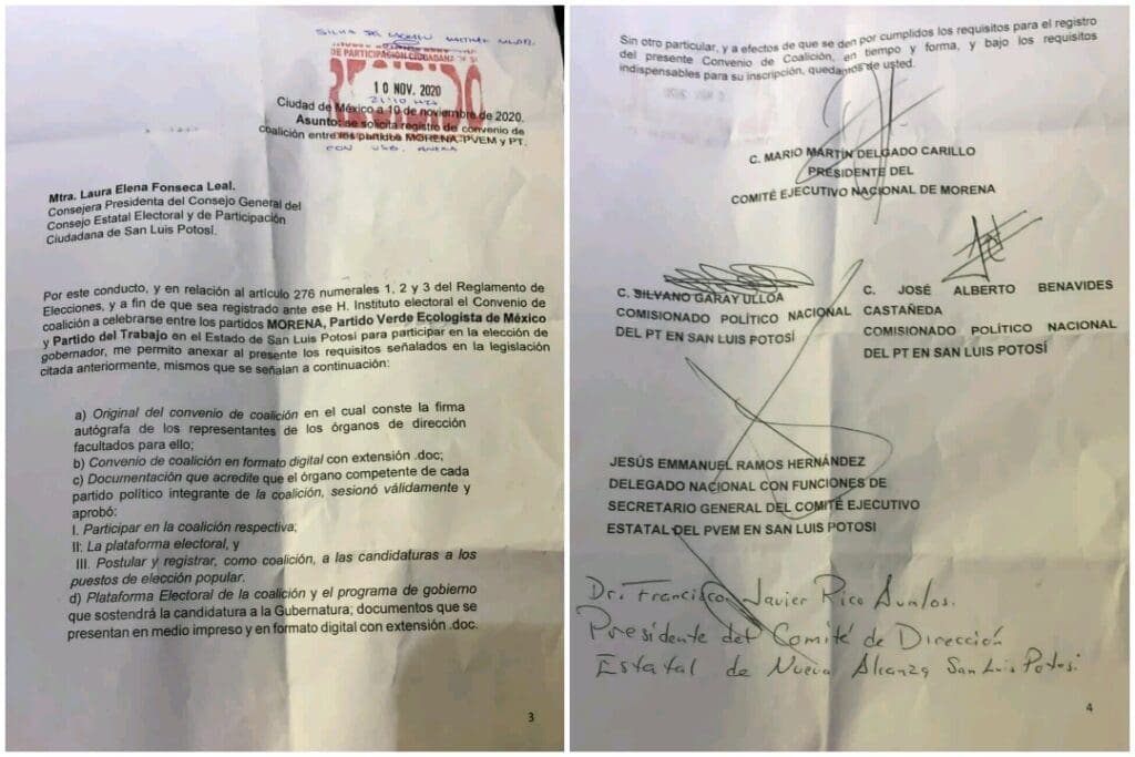 Los partidos, Morena, Verde Ecologista de México, del Trabajo y Nueva Alianza, lograron firmar una coalición para la elección de gobernador del Estado en San Luis Potosí, a pesar de los intentos de grupos de poder para evitar el acuerdo.