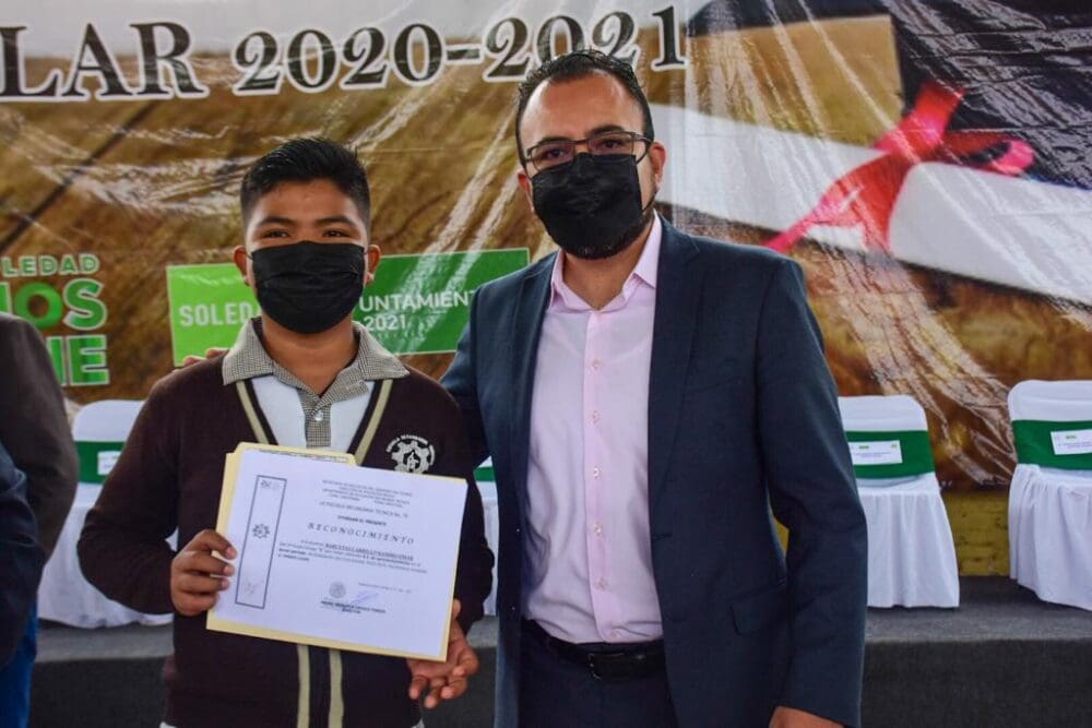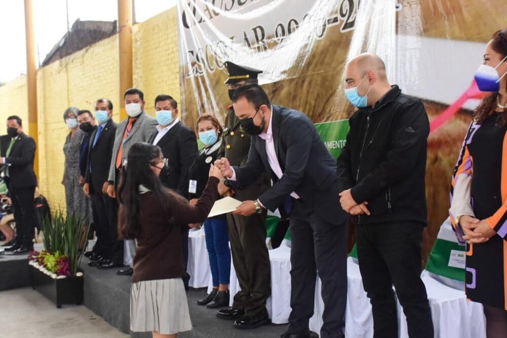El alcalde felicitó a los estudiantes que obtuvieron los mejores promedios, exhortándolos a que sigan disfrutando del estudio y que el aprender sea su principal objetivo en esta etapa de su vida; también los conminó a superar las barreras que nos imponen las circunstancias, como el Covid-19, “nunca nos imaginamos que algo similar nos sucedería y al que ya los tres niveles de gobierno le estamos haciendo frente, como también nuestro proyecto social de gobierno municipal le hace frente a la crisis económica que pone en riesgo la continuidad en los estudios de niñas y niños de familias en condiciones vulnerables, a quienes apoyamos con becas educativas, útiles escolares, uniformes y calzado escolar”.